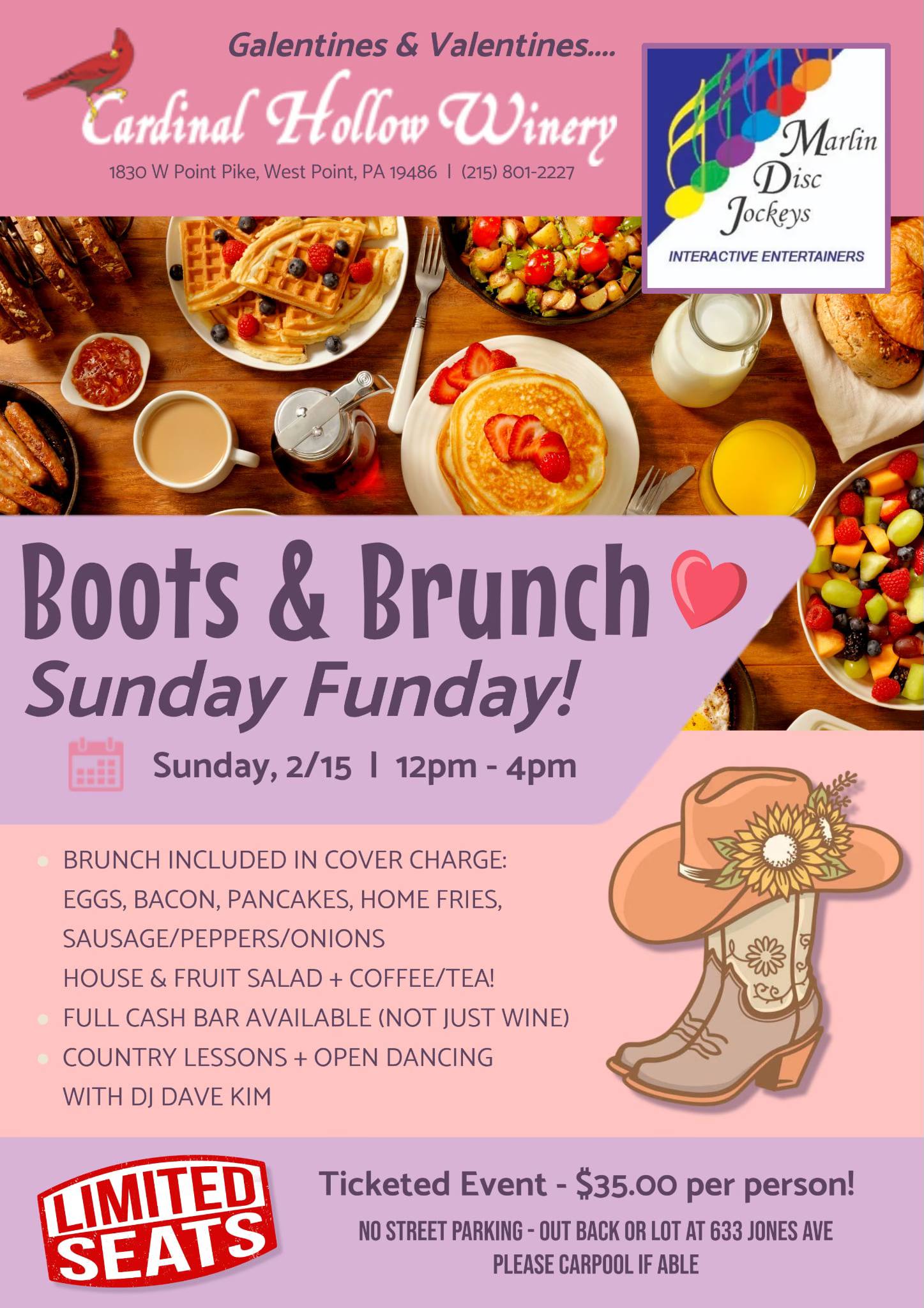 Valentine’s Day Boots & Brunch: February 15, 12-4 pm – Come out for a Boots & Brunch Line Dancing event with DJ Marlin Disc Jockeys. Ticket includes Line Dancing with instructions and a full Brunch Buffet.