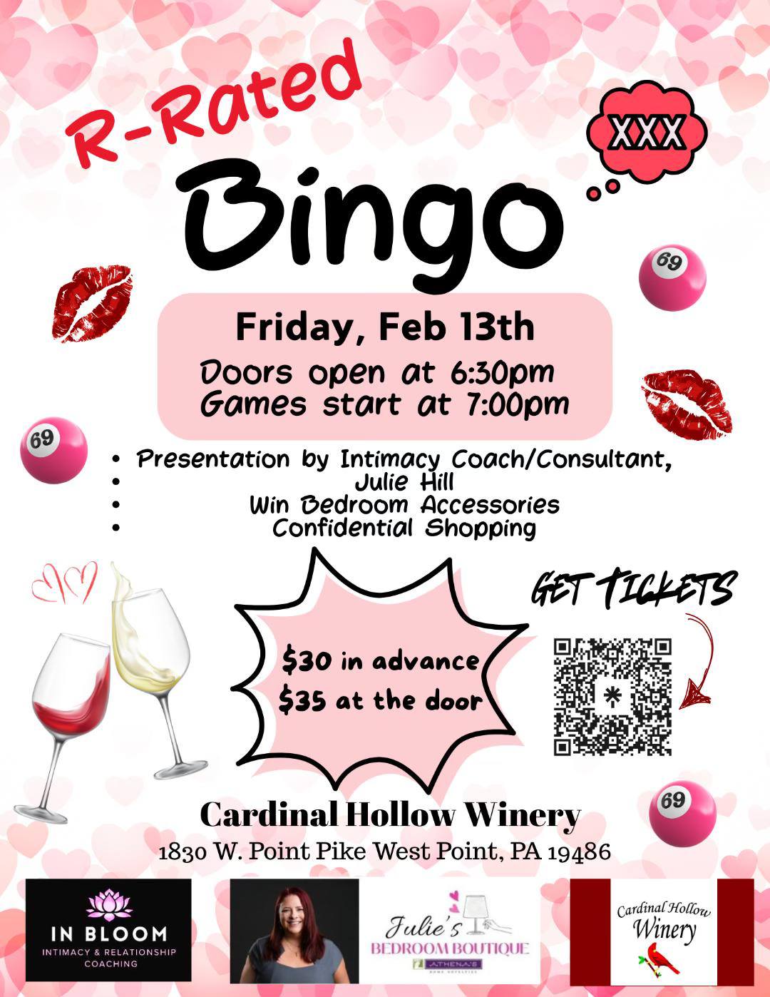 Valentine’s R-Rated Bingo: February 13, 7 pm – Get ready for a wild night of adult-themed bingo with a twist at Cardinal Hollow Winery – it’s going to be a blast!